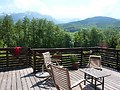Our large mountain home has all modern comforts and is ideal for families, the main living area being open with an american kitchen, large dining area and living room with home cinema, stereo and a wood-pellet stove. The dining area has huge patio doors with a stunning view over the mountains, opening out onto our large terrace with gas bbq, hammock, and dining area with awning. There is also a bathroom and bedroom on this floor.
